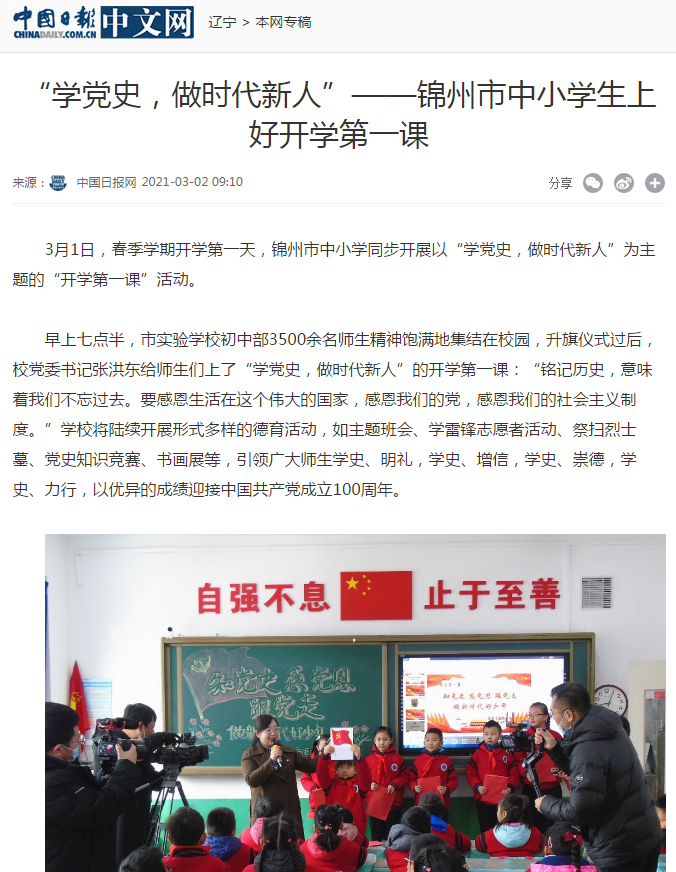 遼甯省各地、各校以“學黨史,做時代新人”為(wèi)主題,多(duō)維度、多(duō)形式、多(duō)渠道開(kāi)展2021年(nián)春季“開(kāi)學第一(yī)課”活動。相(xiàng)關内容經各級媒體報(bào)道後,引發廣泛關注。遼甯省在全國(guó)率先組織學生(shēng)在開(kāi)學第一(yī)課學黨史,做時代新人,緊跟時代,别具特色,取得了較好的宣傳效果,同時也為(wèi)迎接中國(guó)共産黨成立100周年(nián)營造了良好的輿論氛圍。