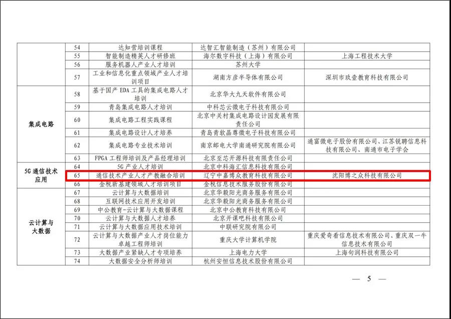 近日,工(gōng)業(yè)和信息化部人才交流中心發布了《工(gōng)業(yè)和信息化重點領域産業(yè)人才培訓項目評審合格名單公示》,正式公布了全國(guó)評審合格的116個(gè)培訓項目名單。遼甯中嘉博衆教育科技(jì)有限公司及聯合申報(bào)單位沈陽博之衆科技(jì)有限公司在5G通(tōng)信技(jì)術(shù)應用領域所申報(bào)的“通(tōng)信技(jì)術(shù)産業(yè)人才産教融合培訓項目”成功入圍名單。