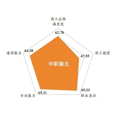 | | 圖5:中職雇主用工(gōng)滿意度維度得分(2019年(nián)) | 1.學生(shēng)就(jiù)學滿意度和雇主用工(gōng)滿意度提升明顯 2019年(nián),中職學生(shēng)就(jiù)學滿意度得分為(wèi)71.81分,與2016年(nián)第一(yī)輪滿意度調查結果相(xiàng)比,提高(gāo)了5.36分,從(cóng)“基本滿意”提高(gāo)到(dào)“比較滿意”水(shuǐ)平;學生(shēng)的教育相(xiàng)對獲得感從(cóng)2016年(nián)的-0.66分提高(gāo)到(dào)3.95分,提高(gāo)了4.61分;行業(yè)、企業(yè)舉辦的中職學校的學生(shēng)就(jiù)學滿意度各維度得分普遍高(gāo)于其他中職學校。雇主用工(gōng)滿意度得分為(wèi)62.78分,提高(gāo)了9.36分。 2.教師(shī)從(cóng)業(yè)和校長(cháng)辦學滿意度均為(wèi)“基本滿意” 2019年(nián),中職教師(shī)從(cóng)業(yè)滿意度得分為(wèi)58.52分,和2016年(nián)相(xiàng)比,下(xià)降了3.91分,總體滿意度高(gāo)于職業(yè)期望,差值為(wèi)2.97分。校長(cháng)辦學滿意度得分為(wèi)60.65分,校長(cháng)總體滿意度和内部滿意度、外部滿意度各維度得分自(zì)東部地區向西(xī)部地區梯度下(xià)降。 3.中職教育呈現期望低(dī)、滿意度高(gāo)的特征 從(cóng)各分項維度得分看(kàn),總體上(shàng)調查對象對中職教育的期望分值普遍偏低(dī),而滿意度分值相(xiàng)對較高(gāo)。在學生(shēng)調查中,分值最高(gāo)的是教育質量感知,其次是就(jiù)學總體滿意度,提高(gāo)幅度最大的是公平感知,提高(gāo)了6.40分。雇主調查中,分值前三依次是中職畢業(yè)生(shēng)職業(yè)意識、專業(yè)能(néng)力和通(tōng)用能(néng)力的滿意度。教師(shī)調查中,分值最高(gāo)的是學校管理,其次是政府保障。校長(cháng)調查中,分值最高(gāo)的是工(gōng)作成就(jiù)與勝任力,其次是工(gōng)作績效,分值最低(dī)的是工(gōng)作負擔适度感。 中職學生(shēng)、教師(shī)、校長(cháng)和雇主在亞群體層面存在明顯差異。學生(shēng)群體中,随著(zhe)學生(shēng)家庭經濟狀況由非常差到(dào)比較好,學生(shēng)在就(jiù)學滿意度6個(gè)維度上(shàng)的得分也相(xiàng)應由低(dī)到(dào)高(gāo),并且差異逐漸擴大;輕紡食品、旅遊服務、醫(yī)藥衛生(shēng)、财經商貿類專業(yè)學生(shēng)滿意度較高(gāo)。教師(shī)從(cóng)業(yè)滿意度在教師(shī)個(gè)人學曆、教齡、職稱以及職業(yè)技(jì)能(néng)水(shuǐ)平上(shàng)呈現出明顯的亞群體差異。校長(cháng)辦學滿意度在學校類型、個(gè)人學曆、收入水(shuǐ)平上(shàng)呈現出明顯的亞群體差異。雇主群體中,招聘中職畢業(yè)生(shēng)最多(duō)的是制造業(yè)企業(yè)、民(mín)營企業(yè)以及操作性崗位,同時雇主用工(gōng)滿意度在行業(yè)類型、企業(yè)性質、招聘渠道、用人崗位上(shàng)存在明顯的亞群體差異。 從(cóng)調查結果看(kàn)中職教育發展取得的成績