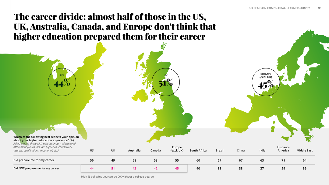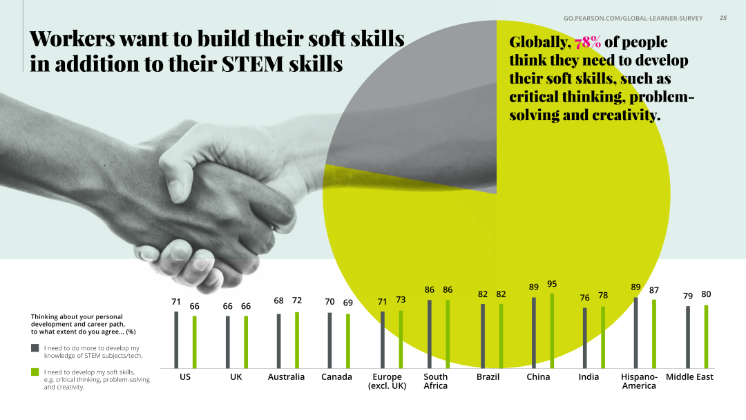傳統教育暴露了越來越多(duō)的短闆,虛拟教育成為(wèi)新常态,碎片式學習成為(wèi)主流,終生(shēng)學習已經成為(wèi)現實…… 一(yī)場由學習者驅動的教育革命正在世界各地展開(kāi),“自(zì)助式學習”的觀念正在重塑教育! 今天我們一(yī)起來看(kàn)一(yī)下(xià),全球教育變革的六大趨勢。 2019年(nián)5月(yuè),皮爾森對來自(zì)19個(gè)國(guó)家的11,000名學習者開(kāi)展了問卷調查,這是世界上(shàng)少有的如此大規模的教育調查。 調查發現:世界各地的學習者仍然對教育抱有很大的信心,他們期待教育能(néng)夠幫助自(zì)己取得成功。但是,他們獲得教育的方式正在改變,他們不再完全依賴于傳統的教育機(jī)構,而是更願意對自(zì)身教育采取“DIY”的方式,除此之外,學習者都表達出終身學習的意願。 調查發現六大主要趨勢 01 “自(zì)助式學習”的觀念正在重塑教育 調查發現,一(yī)種“自(zì)助式”(Do-It-Yourself)的觀念正在重塑教育,人們相(xiàng)信學習将越來越多(duō)地成為(wèi)自(zì)助式服務,尤其是當他們走上(shàng)工(gōng)作崗位後需要知識更新時,這意味著(zhe),混合式、組合式、多(duō)元化和個(gè)性化的學習模式将成為(wèi)越來越多(duō)人的選擇。 02 終身學習已成現實 終身學習不再是一(yī)種理念,它已成現實。40年(nián)的職業(yè)生(shēng)涯時代已經成為(wèi)過去,取而代之的是終生(shēng)學習和多(duō)樣化的職業(yè)道路(lù)。 知識經濟的到(dào)來,傳統的、單一(yī)的職業(yè)路(lù)徑的方式已經過時。學習者需要的是能(néng)夠适應不斷變化的工(gōng)作世界,這就(jiù)意味著(zhe)他們将不斷地學習,且碎片式的學習成為(wèi)主流,這是因為(wèi)其目的已經變為(wèi)工(gōng)作驅動和變革變動下(xià)的學習。 03 數碼和虛拟學習将成為(wèi)新常态 人們已經接受技(jì)術(shù)成為(wèi)教育的一(yī)部分,技(jì)術(shù)可以提升學習體驗,已被視為(wèi)教育的未來。大多(duō)數受訪者認為(wèi),人工(gōng)智能(néng)(AI)和其它技(jì)術(shù)創新可以讓學習變得更有吸引力。 數碼和虛拟學習的另一(yī)個(gè)好處是,讓學習變得更加經濟、便捷、容易,學習的邊界進一(yī)步得到(dào)了拓展和延伸,不再局限于學校。 04 對傳統教育系統的信心正在動搖 來自(zì)世界各地的許多(duō)受訪者都表達出:傳統教育沒有提供更多(duō)幫助,即使沒有正規學曆和教育經曆,也無礙他們找到(dào)工(gōng)作。 許多(duō)國(guó)家的工(gōng)作者開(kāi)始選擇除高(gāo)等教育外的其它學習途徑 ,以期掌握新的技(jì)能(néng)。通(tōng)過參加短期課程、雇主或專業(yè)協會(huì)提供的進修課程、學位課程或自(zì)學來提高(gāo)自(zì)己的工(gōng)作水(shuǐ)平。接近一(yī)半的英國(guó)受訪者表示,會(huì)重新考慮是否接受傳統高(gāo)等教育,高(gāo)等教育并不能(néng)有效地幫助他們做好就(jiù)業(yè)準備。 05 軟技(jì)能(néng)比自(zì)動化更有優勢 雖然STEM教育備受矚目,但人們逐漸意識到(dào):人類獨有的人際技(jì)能(néng)将使人類優于人工(gōng)智能(néng),如創造力、獨創性、解決問題和批判性思維等軟技(jì)能(néng)。許多(duō)受訪者提出,大學需要更加專注于這些軟技(jì)能(néng),為(wèi)學生(shēng)進入職場做好充分準備。 06 網絡和校園欺淩使學校管理尤為(wèi)困難 調查結果顯示,現如今社交媒體和校園暴力加劇了學校安全問題的發生(shēng),84%的美國(guó)人認為(wèi)學校安全性遠(yuǎn)低(dī)于25年(nián)前,學校管理也變得極為(wèi)困難。 教育革命的挑戰 上(shàng)述調查顯示出的種種變化都可歸因于:新的人才經濟來臨所帶來非常規的職業(yè)道路(lù)和技(jì)術(shù)壟斷。新的時代将為(wèi)學習者打開(kāi)一(yī)個(gè)新的局面,使其以更便捷、更經濟的方式進行學習。參與調查的學習者表現出對技(jì)術(shù)和在線學習的熱愛,他們希望接受更多(duō)的職業(yè)教育和軟技(jì)能(néng)培訓。 面對新時代的新需求,世界各國(guó)應該建立一(yī)個(gè)更廣泛的教育生(shēng)态系統,以滿足學習者的學習需求。 大學可以為(wèi)成人提供更多(duō)接受短期課程和軟性課程的機(jī)會(huì);企業(yè)可以與教育機(jī)構合作,為(wèi)員(yuán)工(gōng)提供量身定做的培訓;教育公司可以利用技(jì)術(shù)來提高(gāo)教育的參與度和普及性;政府部門(mén)可以采取相(xiàng)應舉措,幫助學習者可以更經濟、更廣泛地獲取教育機(jī)會(huì)和教育資源。 通(tōng)過傾聽學習者的聲音(yīn),可以幫助全球引領新經濟的增長(cháng)。通(tōng)過教育改善生(shēng)活,21世紀的技(jì)術(shù)進步為(wèi)我們提供了人類曆史上(shàng)的最大機(jī)會(huì)。期待看(kàn)到(dào)共同實現的進步,使學習者的願景成為(wèi)現實。