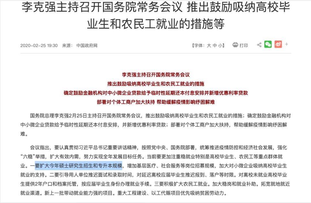 據中國(guó)政府網消息,國(guó)務院總理李克強2月(yuè)25日主持召開(kāi)國(guó)務院常務會(huì)議,推出鼓勵吸納高(gāo)校畢業(yè)生(shēng)和農民(mín)工(gōng)就(jiù)業(yè)的措施。其中就(jiù)包括“擴大今年(nián)碩士研究生(shēng)招生(shēng)和專升本規模”。還(hái)指出對延遲離校畢業(yè)生(shēng)推遲報(bào)到(dào)、落戶等時限。對離校未就(jiù)業(yè)畢業(yè)生(shēng)提供2年(nián)戶口和檔案托管,按應屆畢業(yè)生(shēng)辦理就(jiù)業(yè)手續。 會(huì)議指出:當前要更加注重穩就(jiù)業(yè)特别是高(gāo)校畢業(yè)生(shēng)、農民(mín)工(gōng)等重點群體就(jiù)業(yè)。 一(yī)要擴大碩士研究生(shēng)招生(shēng)和專升本規模,增加基層醫(yī)療、社會(huì)服務等崗位招募。 二要對延遲離校畢業(yè)生(shēng)推遲報(bào)到(dào)、落戶等時限。對離校未就(jiù)業(yè)畢業(yè)生(shēng)提供2年(nián)戶口和檔案托管,按應屆畢業(yè)生(shēng)辦理就(jiù)業(yè)手續。 三要擴大農民(mín)工(gōng)就(jiù)業(yè)。加大穩崗和就(jiù)業(yè)補助。促進就(jiù)地就(jiù)近就(jiù)業(yè)。 中國(guó)政府網截圖 2月(yuè)22日,湖(hú)南(nán)發布《應對新冠肺炎疫情做好高(gāo)校畢業(yè)生(shēng)就(jiù)業(yè)創業(yè)工(gōng)作十條措施》,明确擴大應屆高(gāo)校畢業(yè)生(shēng)升學深造規模: 争取國(guó)家支持,2020年(nián)全省增加5%研究生(shēng)招生(shēng)計劃,将專升本錄取比例擴大1倍以上(shàng)。适當提高(gāo)應屆大學畢業(yè)生(shēng)士兵退伍後專升本錄取比例。 此外,“十條措施”對高(gāo)校畢業(yè)生(shēng)的就(jiù)業(yè)、創業(yè)也做出相(xiàng)關的政策性支持: “十條措施”鼓勵企業(yè)吸納高(gāo)校畢業(yè)生(shēng)就(jiù)業(yè): 省屬國(guó)有企業(yè)要從(cóng)新增崗位中拿出不低(dī)于50%的崗位專門(mén)招聘應屆高(gāo)校畢業(yè)生(shēng),招聘信息應同步提交同級人社部門(mén)在網上(shàng)公開(kāi)發布。疫情防控期間,中小(xiǎo)微企業(yè)吸納高(gāo)校畢業(yè)生(shēng)穩定就(jiù)業(yè)1年(nián)以上(shàng)并按規定繳納社會(huì)保險的可按1000元/人的标準給予其一(yī)次性吸納就(jiù)業(yè)補貼。 鼓勵高(gāo)校畢業(yè)生(shēng)面向基層就(jiù)業(yè): 2020年(nián),省内計劃招收定單定向全科醫(yī)生(shēng)計劃1500名、少數民(mín)族高(gāo)層次骨幹人才計劃200名、“三支一(yī)扶”計劃400名。 鼓勵創業(yè): 對已發放(fàng)創業(yè)擔保貸款的高(gāo)校畢業(yè)生(shēng),因患新冠肺炎可向貸款銀(yín)行申請展期還(hái)款,展期期限原則上(shàng)不超過1年(nián),财政部門(mén)繼續給予貼息支持,并相(xiàng)應調整信用記錄。鼓勵高(gāo)校畢業(yè)生(shēng)以多(duō)種方式實現靈活就(jiù)業(yè),對離校2年(nián)内未就(jiù)業(yè)高(gāo)校畢業(yè)生(shēng)靈活就(jiù)業(yè)的,按規定給予社會(huì)保險補貼,補貼标準為(wèi)其個(gè)人實際繳費(fèi)的40%,補貼期限最長(cháng)不超過2年(nián)。