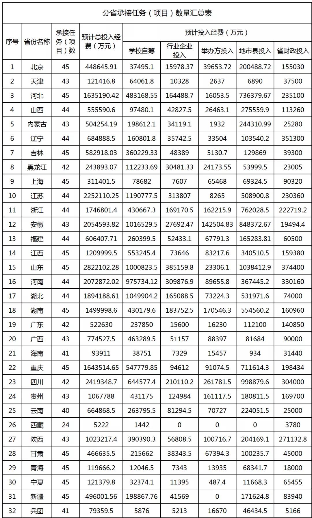 1月(yuè)14日,教育部職業(yè)教育與成人教育司發布《職業(yè)教育提質培優行動計劃(2020—2023年(nián))》任務(項目)承接情況的通(tōng)知,根據《關于承接〈職業(yè)教育提質培優行動計劃(2020—2023年(nián))〉任務(項目)的通(tōng)知》(教職成司函〔2020〕32号)要求,各省級教育行政部門(mén)積極組織申報(bào),确定了本地拟承接的任務(項目)數量、承接單位和支持經費(fèi)。