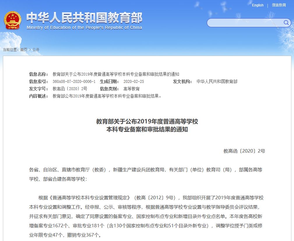 近日,教育部印發“關于公布2019年(nián)度普通(tōng)高(gāo)等學校本科專業(yè)備案和審批結果的通(tōng)知”,将2019年(nián)度普通(tōng)高(gāo)等學校本科專業(yè)備案和審批結果予以公布。